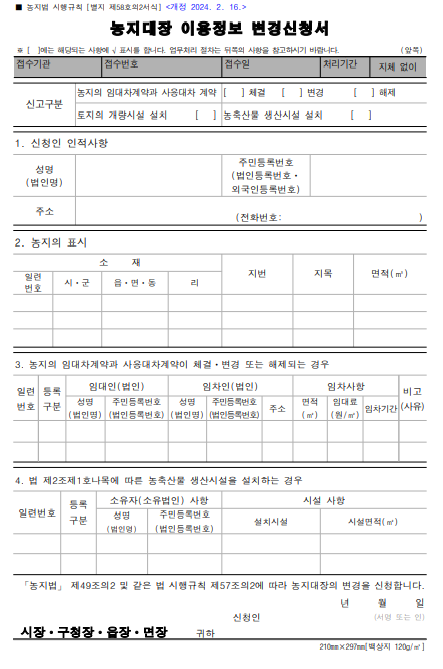 ![(농지법 시행규칙)-[별지 제58호의2서식] 농지대장 이용정보 변경신청서-앞장](https://blog.kakaocdn.net/dna/5itxw/btsKmKdaLVK/AAAAAAAAAAAAAAAAAAAAAAznqH16_o9FXaFhbgxfS-bC-l1YPkA4dVznArkUce8O/img.png?credential=yqXZFxpELC7KVnFOS48ylbz2pIh7yKj8&expires=1764514799&allow_ip=&allow_referer=&signature=qLP3cajjiqrSwLAEQRMxwa%2FUvww%3D)